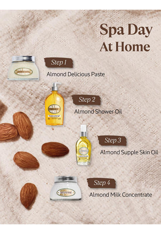 • คุณค่าจากน้ำมันอัลมอนด์จะปกป้องน้ำมันในผิวให้กลับสู่สมดุล พร้อมด้วยกลิ่นหอมของอัลมอนด์