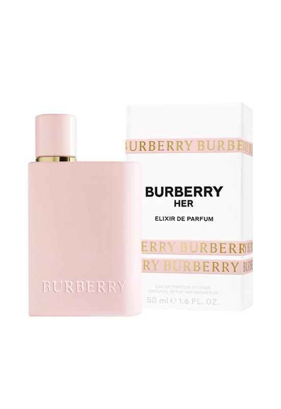 Burberry Her Elixir de Parfum deepens the pink of the Eau de Parfum bottle, transforming it into an opaque finish representing the intensity of the fragrance inside and its confident and sensual nature. The outer design features raised Burberry lettering at the base.