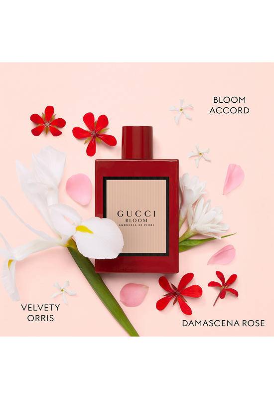 The Gucci Bloom scents are inspired by the idea of absolute authenticity, the freedom to be who you are. Gucci Bloom Ambrosia di Fiori invites those who wear it to celebrate their true selves and the emotions they feel. Matching this expression, the perfume is deepened in a refined Eau de Parfum Intense.