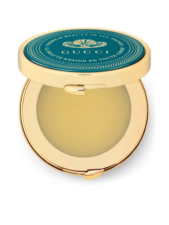 A multi-use, fragrance-free balm made from 100% natural origin ingredients, Baume Nourrissant Universel is set to become a wonder fix and go-to for all sorts of beauty needs. Whether you’re looking to nourish the lips, or help to reduce areas of dryness, it is designed to soothe the skin in multiple ways, while a mix of botanical oils and flowers produce its weightless texture. Create peaceful, cherished moments by letting this balm encapsulated in a treasurable compact indulge the senses wherever and whenever the mood strikes. The Formula and Application The comfortable, silky feel of the Baume Nourrissant Universel is created with a caring formula filled with a highly concentrated blend of botanical oils, natural oils and butter. With its nourishing properties, Shea Butter reduces the overall feeling of dryness, while Jojoba and Castor Oils are natural ingredients that smooth skin and provide an instant sensation of moisture. Meanwhile, the star ingredient is Black Rose Oil, which is infused with antioxidant benefits that soothe the skin before or after makeup application. The Design and Range A treasured compact with a mirror, this vintage-inspired object of desire was designed to be carried anywhere. Encased in gold metal with an aqua blue trim and intricate gold pattern, lettering on the case lid includes the poetic line: ‘There is beauty in all things’ written in French and English, as well as the Gucci lettering logo and a flourishing illustration of a clam shell.