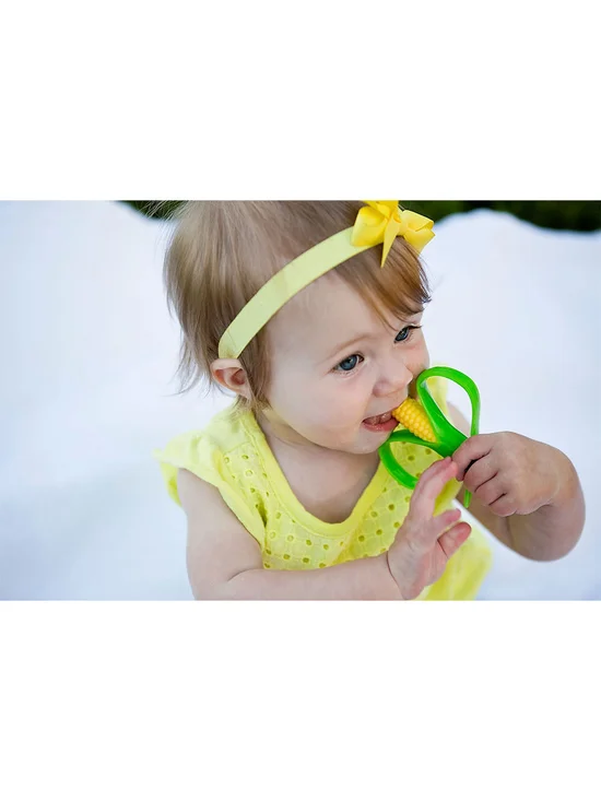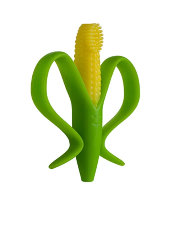 Corn Cob Infant Toothbrush from BABY BANANA brand name. Realistic corn kernel texture provides stimulating teething relief. Completely flexible to prevent oral injury. Thick bristles help to break up sugars on the gums. Flexible corn husks are not only easy to hold, but fun for babies to chew on too.