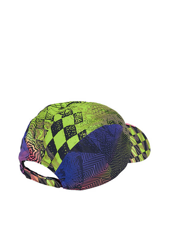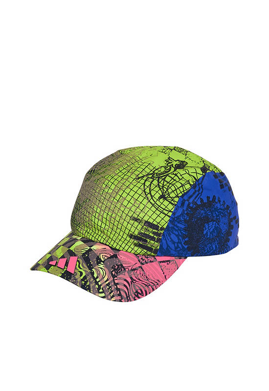 ADIDAS This adidas cap, created in collaboration with Jeremy Scott, shields your eyes from the sun with distinctive style. The pre-curved brim comes ready to wear. The colorful print blends vibrant colors with the flashing disco lights of a nightclub.