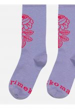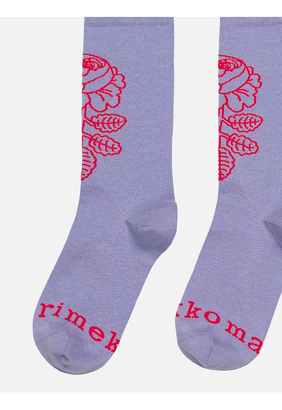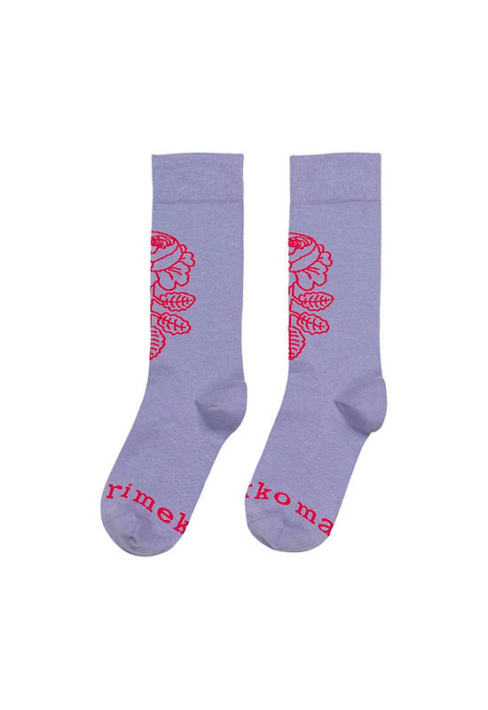 The Detsku rib knit ankle socks are made of a cotton blend, and they feature one large Vihkiruusu pattern flower. Sock has a Marimekko logo text on the tip of the sock.