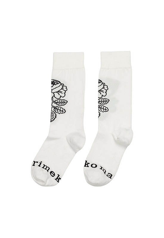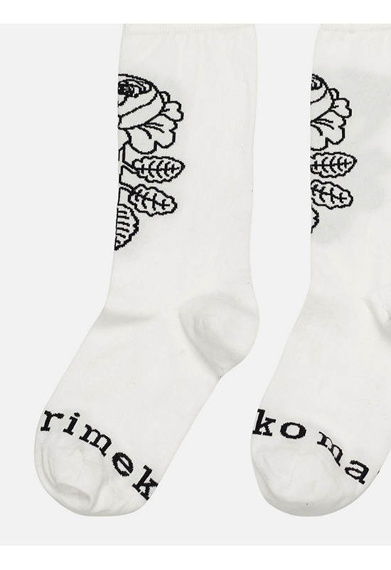 The Detsku rib knit ankle socks are made of a cotton blend, and they feature one large Vihkiruusu pattern flower. Sock has a Marimekko logo text on the tip of the sock.