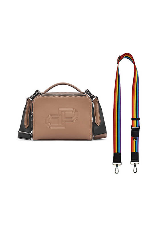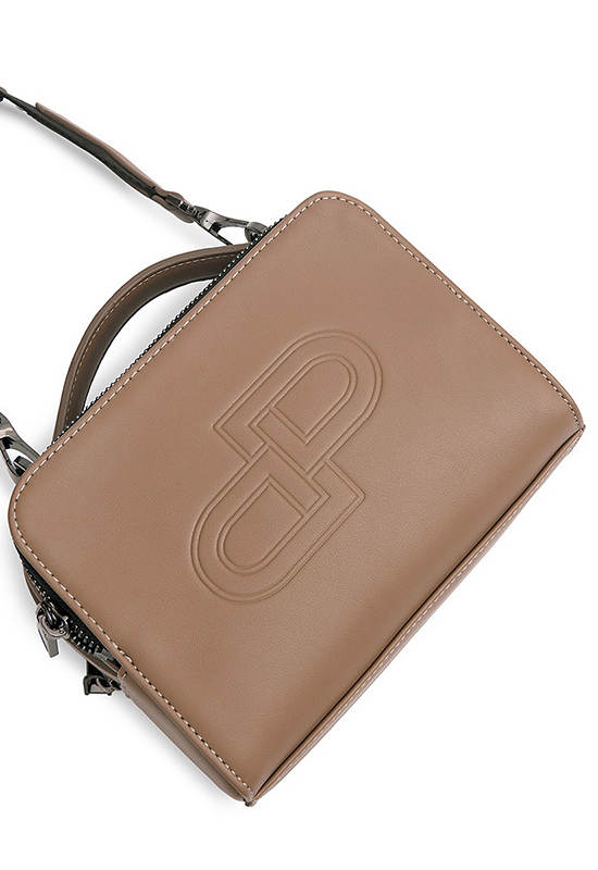 Top handle crossbody bag, crafted in Smooth beige PU Decorated with DP Interlock Icon Embossed on front part. black zip-black Shouder strap, Shiny black hardware, Beige twill lining inside for easy to use. Double zip main pocket, three card slot inside, Slip pocket. Crossbody or hand carry. Adjustable & Detachable webbing strap. This bag is for those who appreciate both functionality & style