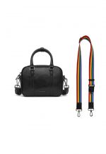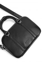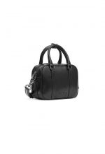 Top Handle Crossbody in Wrinkle-Effect Faux Leather in black Which features insert vertical card pocket on the back panel. Main compartment with shiny metal zip closure. One is slip pocket inside Other side with nylon zip pocket. Polished shiny black metal logo & other hardware. Detachable and removable shoulder strap with mini D-ring for Attached key ring. Top handle with Snap button