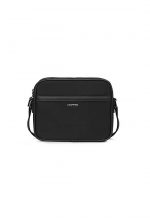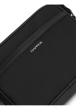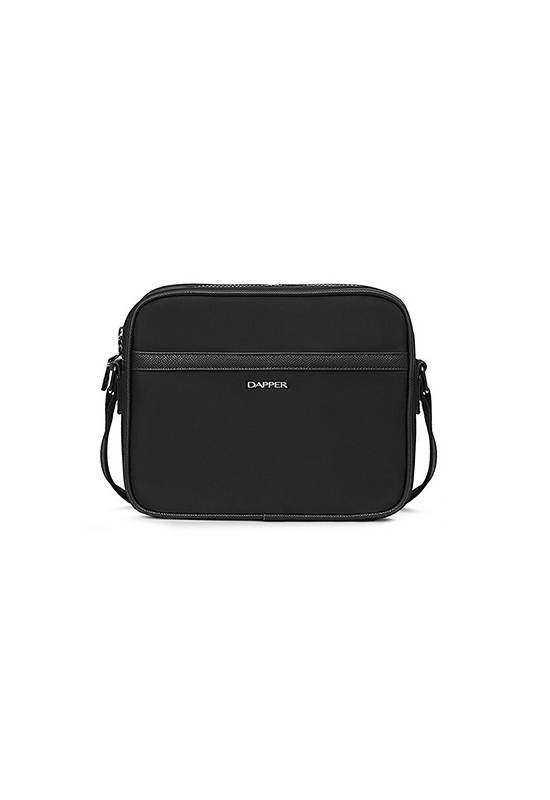 DAPPER Zip crossbody bag, Combines Cross grain faux leather and Smooth Nylon fabric with Dapper shiny black metal emblem on front Compact size is compartmentalized for optimal organization. Plastic zip main pocket friendly with gadgets. Internal nylon zipped pocket. Insert front pocket with Magnetic closure, Faux leather binding. This bag is practical and easy to match with modern style. Monochrome.