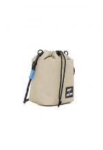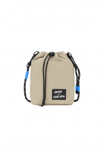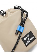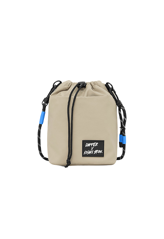 Dapper X Khaki Bros. Water Repellent Drawstring bucket bag with Matte khaki coating nylon twill fabric for the weather resistant Crossbody strap made of Black and White dot paracord rope inspired by Outdoor gear. Strap can detachable and adjustable DAPPER X KHAKI BROS black & white rubber badge at front part Decorated with Cobalt blue accent Lining Fabric & paracord stopper