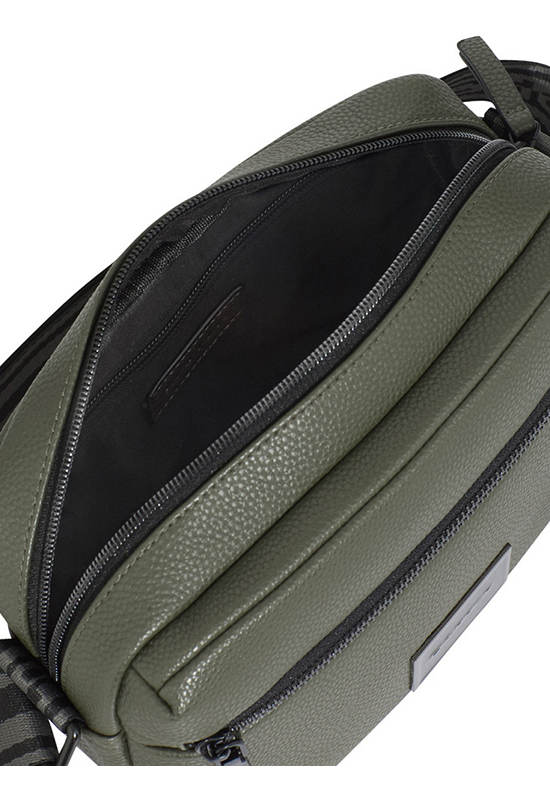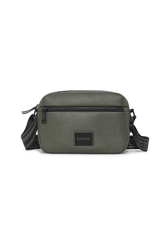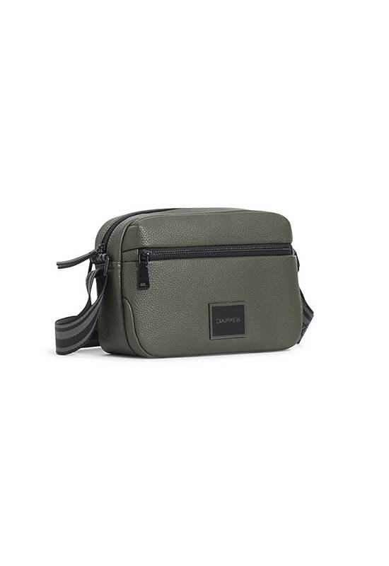 Double zip crossbody bag, crafted in soft flat grain PU in Olive Green. Decorated Metal square frame with black inlay “DAPPER” logo. Nylon zipper main pocket for non scratch gadget & etc. Matte black metal zipper puller at front part & main PU zipper puller. Inside slip pocket and zipper pocket. Adjustable shoulder strap in black and grey Dapper logo webbing Matte black buckle