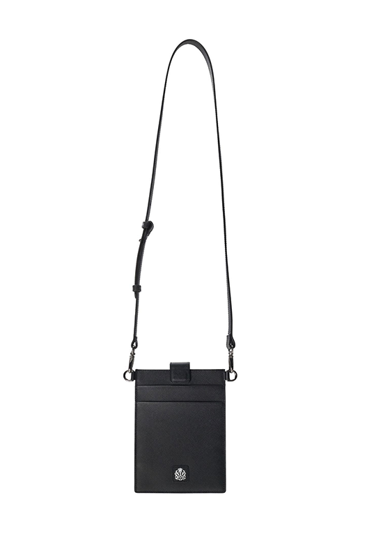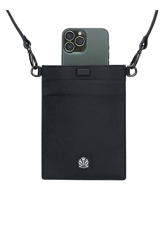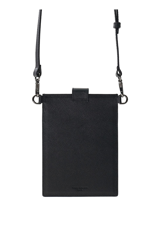 This crossbody pouch, crafted from Saffiano-embossed cow leather, is a popular material among TAKEO KIKUCHI customers due to its scratch-resistant durability. Designed with a silver foil logo, this pouch suits the modern individual seeking comfort, mobility, and value. It features three compartments, including one with a leather strap closure that fits essentials such as a smartphone (up to iPhone Pro Max).
