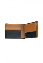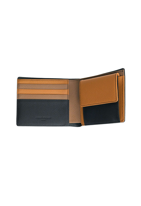 A compact wallet crafted from premium grain leather, featuring the natural texture and softness that define this high-quality material. The leather has a subtle matte finish, making it easy to care for and perfect for everyday use. This wallet highlights a classic design—one of our best sellers—enhanced with playful color-block details for a modern twist. The logo is stamped in elegant silver foil at the center front, adding a refined touch.