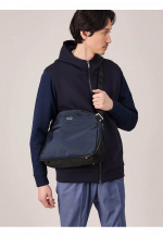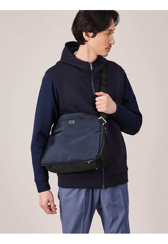 A horizontally shaped shoulder bag made from synthetic dobby fabric, designed to fit A4-sized documents. Its standout feature is the expandable base, allowing you to adjust the bag’s depth to accommodate varying amounts of belongings.