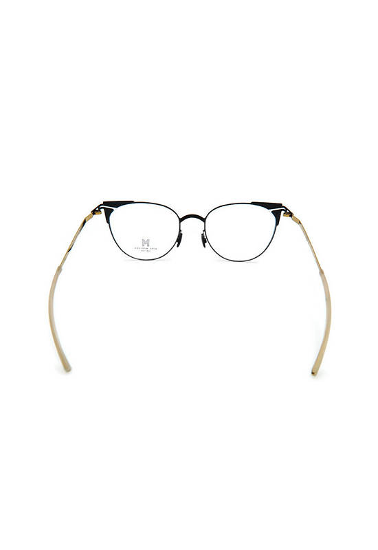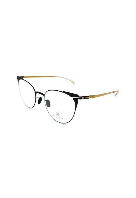 The Zanta-AF C2 glasses frame has a black Titanium frame with a matt surface and top bezel is decorated with black triangular Titanium with a matt surface. The nose pads are black Silicone with a matt surface. The glasses legs are gold Titanium with a shiny surface. The end legs cap are covered in semi-transparent white Silicone with a matt with a shiny surface.