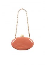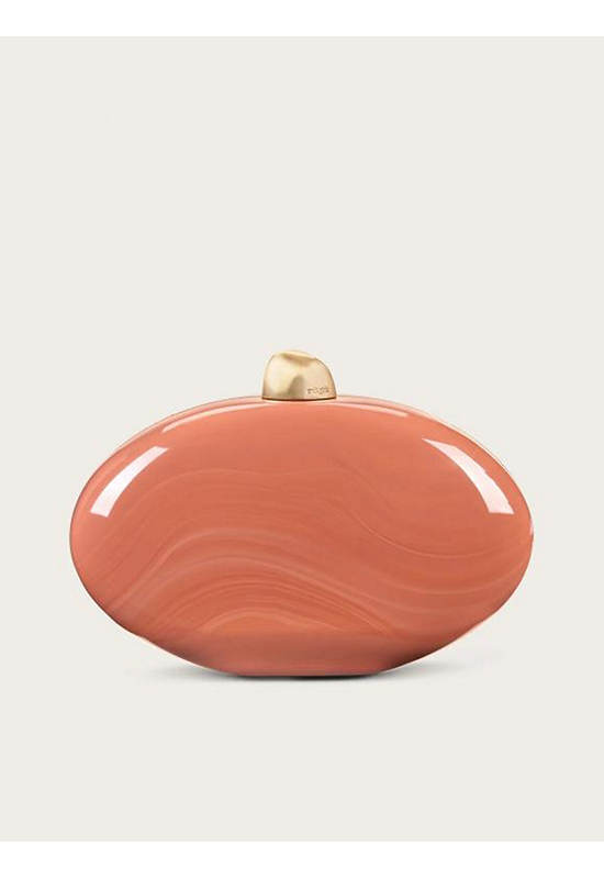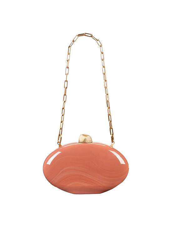Elevate your look with this marbled acrylic oval clutch, featuring an abstract gold top closure and removable chain strap. Stylish and functional, its clutch design fits your phone perfectly for effortless glam on the go.