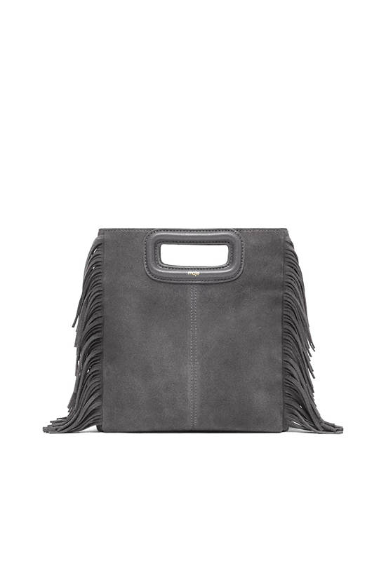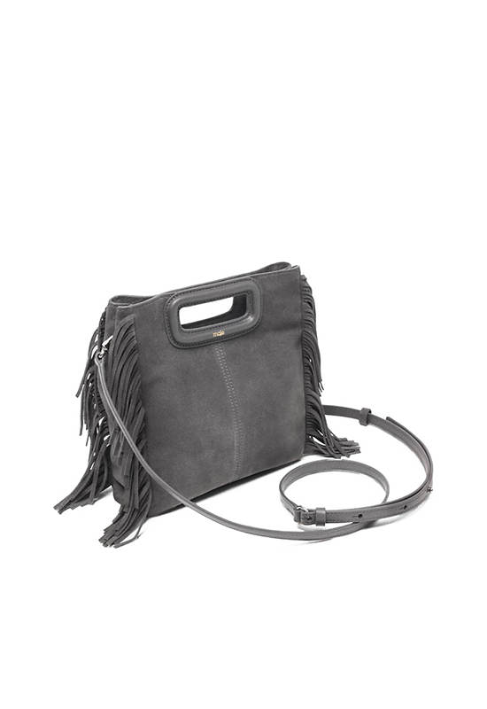 Maje’s iconic M bag is available in suede leather. Featuring fringe detailing on the sides and a sheathed handle, it has an embossed gold logo and a signature engraved on the buckles. It comes with a practical magnetic fastening and an adjustable, removable strap that allows it to be carried in a variety of ways: by hand, on the shoulder or crossbody.