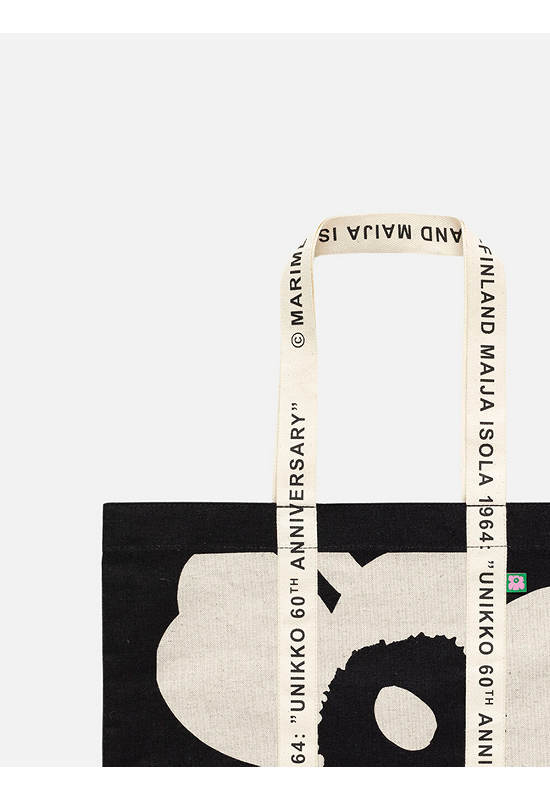 The Carrier Midi tote bag is made of an unbleached cotton and linen blend, and it features the large Unikko pattern flower, which is printed in Helsinki. The “Unikko 60th anniversary” printed cotton straps run along the sides of the bag to form the handles.