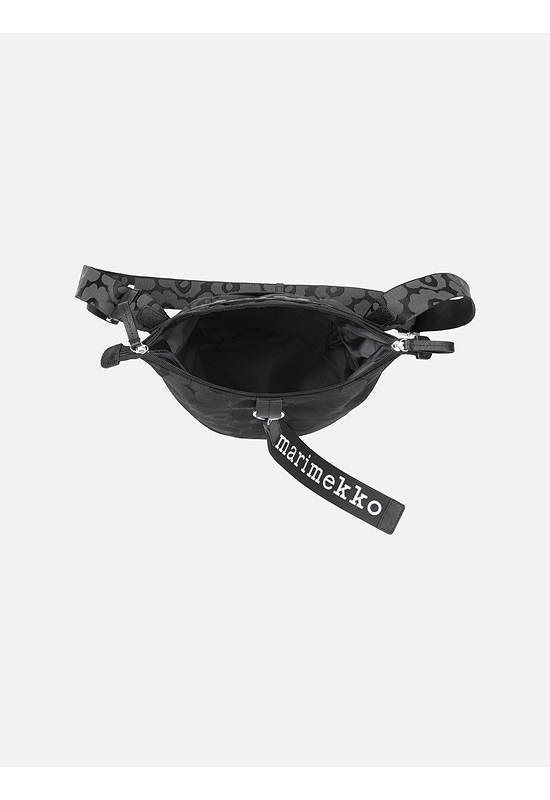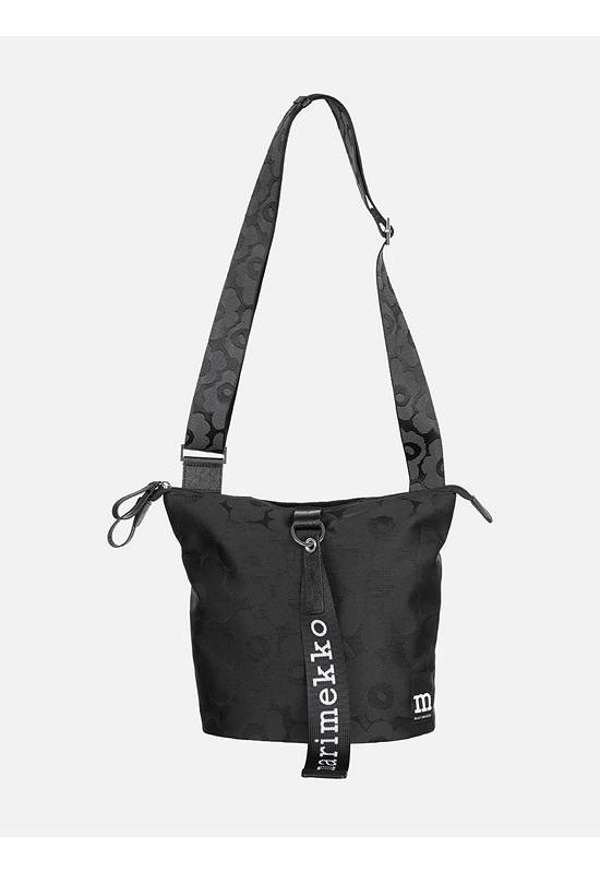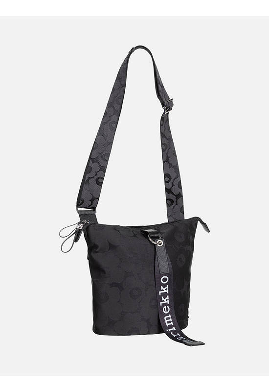 The bag has a zipper closure, a handle, and an adjustable, jacquard knit Unikko pattern shoulder strap, which is made of recycled polyamide. There is an open pocket on the inside and an open pocket on the outside that closes with a magnetic button. The Marimekko keychain is attached to the front. The bag has leather details.