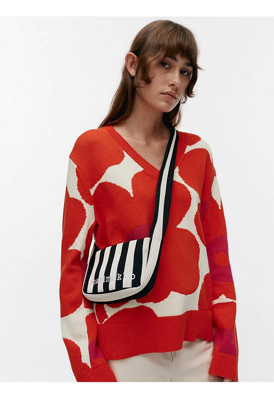 The Knitted Mini Shoulderbag features the jacquard knit Merirosvo pattern, and it is made of firm recycled polyester with a ribbed look. The bag features a wide shoulder strap, a zipper closure, and the embroidered Marimekko logo on the front.