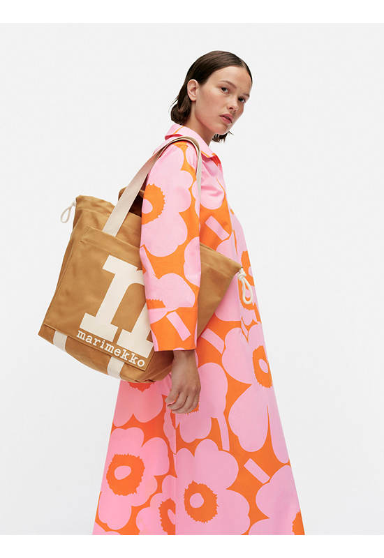 The Mono City Tote is made of organic cotton. The large Marimekko “M” is printed in the front. The bag has both short and long handles, and an open pocket on the outside. There are drawstrings at the sides that can be used to tighten the opening and change the silhouette of the bag.