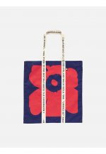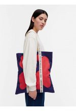 The Carrier Midi tote bag is made of an unbleached cotton and linen blend in the Unikko pattern, which is printed in Helsinki. The “Marimekko Kioski” printed cotton straps run along the sides of the bag to form the handles.