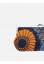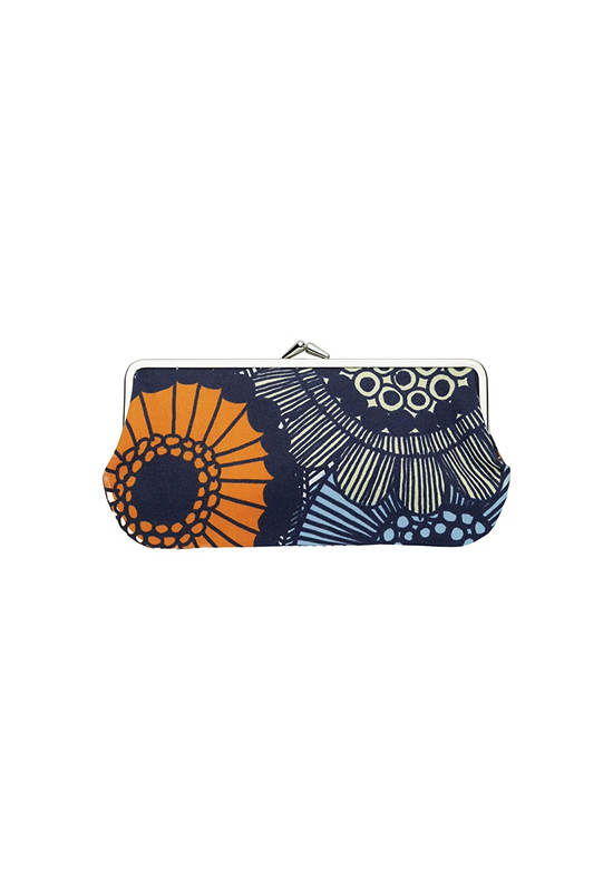 The Silmälasi Kukkaro purse is made of unbleached cotton in the Pieni siirtolapuutarha pattern, which is printed in Helsinki. The slim rectangular purse has a metallic frame that is easy to snap open and shut.