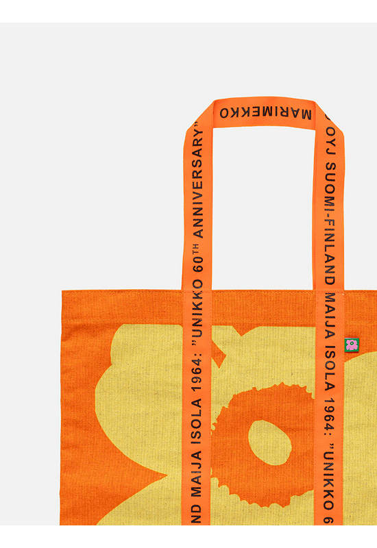 The Carrier Midi tote bag is made of an unbleached cotton and linen blend, and it features the large Unikko pattern flower, which is printed in Helsinki. The “Unikko 60th anniversary” printed cotton straps run along the sides of the bag to form the handles.