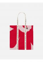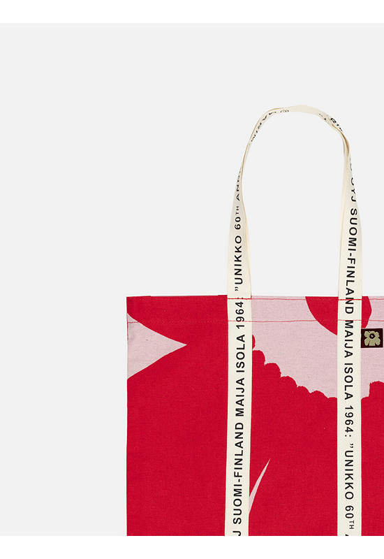 The Carrier Midi tote bag is made of an unbleached cotton and linen blend, and it features the large Unikko pattern flower, which is printed in Helsinki. The “Unikko 60th anniversary” printed cotton straps run along the sides of the bag to form the handles.