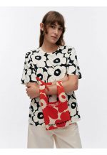 The Knitted Mini Tote bag features the jacquard knit Unikko pattern, and it is made of firm recycled polyester with a ribbed look. The small bag has handles and it features the embroidered Marimekko logo on the front.