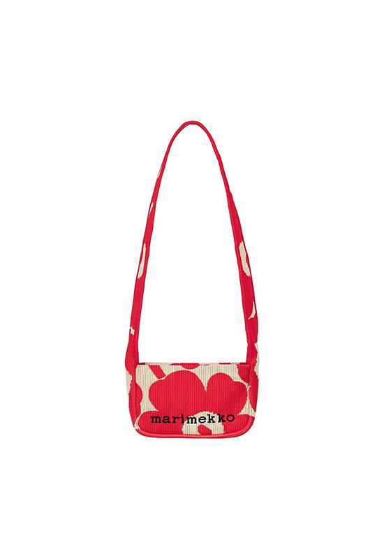 The Knitted Mini Shoulderbag features the jacquard knit Unikko pattern, and it is made of firm recycled polyester with a ribbed look. The bag features a wide shoulder strap, a zipper closure, and the embroidered Marimekko logo on the front.
