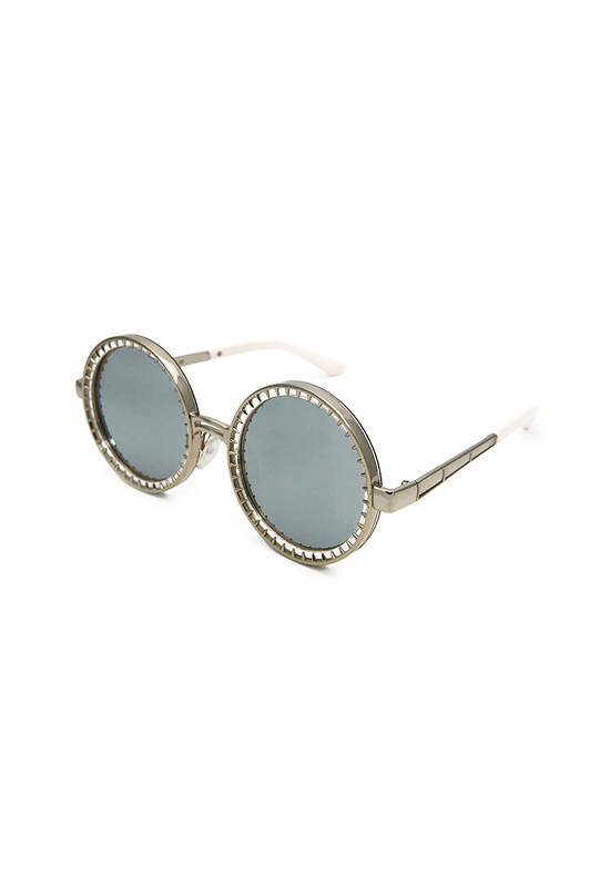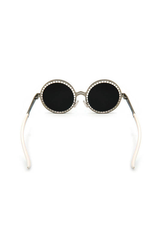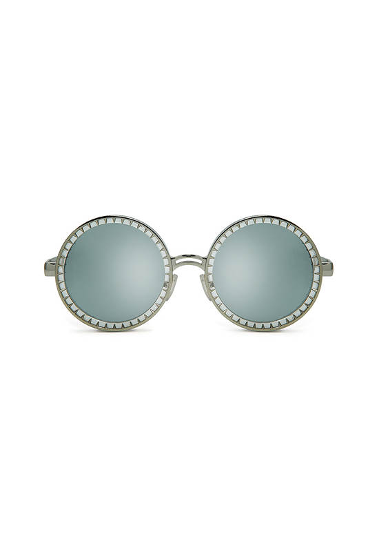 The Dollar C2 sunglasses, the inner frame are clear Acetate with shiny surface and the outer frame are silver metal with shiny surface. The lenses are silver mirror lens, making it look opaque and helping to cover the eyes of the wearer very well. The sunglasses legs are silver metal with shiny surface. The end legs cap are covered in white plastic with a shiny surface.