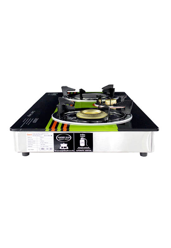 Product Detail : 1. Three burners gas stove. ( 1 infrared burners and 2 brass burner. ) 2. Automatic ignition gas stove. 3. High quality ceramic infrared burners, 49 porous honeycomb per 1 sq.cm. 4. Brass burners are easy to clean, long life and no rust. 5. The high temperature infrared burner can save up to 30% gas consumption. 6. The gas stove is one band, but the heat equivalent to two bands (inner and outer). 7. The top panel is made of 8mm tempered glass. Gas frame is made of stainless steel. 8. Tempered glass is heat resistance, non-conductive thermal and easy to clean. 9. All burners operate freely. 10. The Heat can be adjusted to suit the utensil or cooking style. 11. Suitable to every household. How to : Used for heating to cooking. Caution : 1. Must be installed with Low Pressure regulator. 2. Turn off the gas valve on gas tank and gas stove every time after use. 3. Please check gas stove and gas tank condition every time before use. 4. Not suitable for commercial. Color : Color of Product : Black glass / Green / Orange Color of Carton box : Brown/Green Type or Style : Three burner gas stove automatic ignition system. Main material : Tempered glass, 1 infrared burners and 2 brass burner and stainless steel body. Product dimensions ( cm.) : Width 38 Length 72.5 Height 12.5 Gift box sizes ( cm.) : Width 43 Length 76 Height 105 Outer box sizes (cm.): Width 43 Length 76 Height 105 Net weight (grams) : 8,750 2-year warranty on the system “Gas Ignition Valve” 1 year warranty on “machine and equipment”