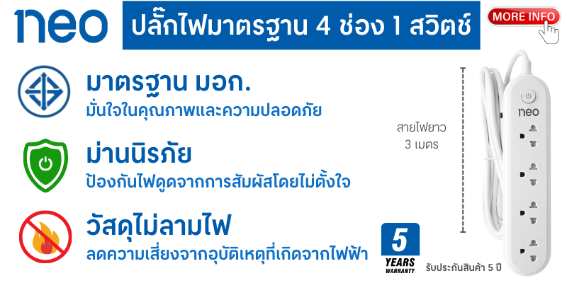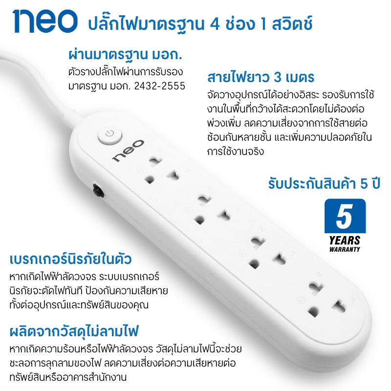 NEO รางปลั๊กไฟ 1 สวิตซ์ 4 ช่อง 3 เมตร คือทางเลือกที่ดีสำหรับการใช้งานที่ต้องการความปลอดภัยและสะดวกสบายในการใช้งานไฟฟ้า ด้วยการรับประกันสินค้า 5 ปี และคุณสมบัติที่ช่วยให้คุณใช้งานอุปกรณ์ไฟฟ้าได้อย่างปลอดภัย ไม่ต้องกังวลเรื่องไฟฟ้าลัดวงจร อย่ารอช้า กดดสั่งซื้อรางปลั๊กไฟ NEO รุ่นนี้เพื่อการใช้งานที่ปลอดภัยและคุ้มค่าที่สุด!