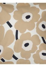 Made from a cotton, this cushion cover features the off white, beige and dark blue Pieni Unikko pattern. 50% of cotton used in product is recycled. Fabrics containing recycled fibers, have a natural lively color and surface where small different colored areas may appear. There may be differences between products regarding this feature.