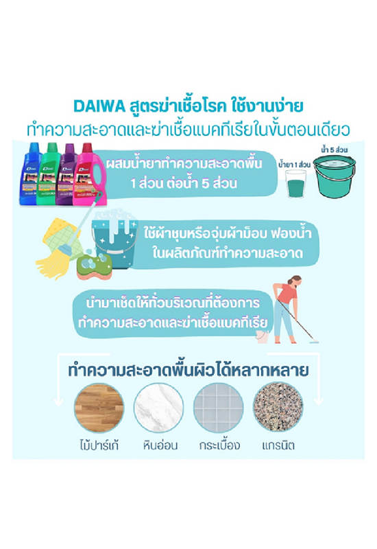 เลือก น้ำยาถูพื้น DAIWA สำหรับทำความสะอาดพื้นที่ของคุณให้สะอาดเอี่ยมอ่อง และหอมสดชื่นอยู่เสมอ กดสั่งซื้อเลยตอนนี้! เพื่อสร้างบรรยากาศที่น่าประทับใจทั้งผู้อยู่อาศัย และแขกผู้มาเยือน