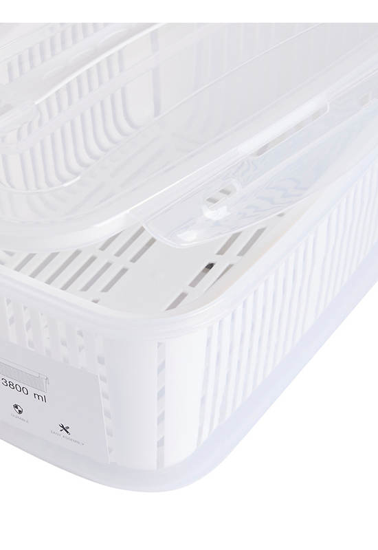 • Refrigerator storage container set with a basket, allowing excess water to drain from foods, fruits, vegetables, and fresh produce to prevent bruising.