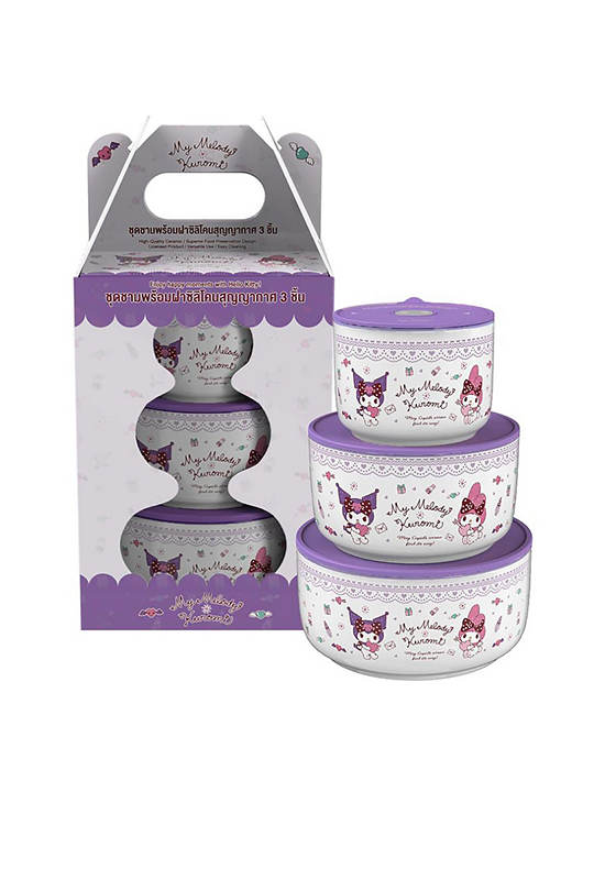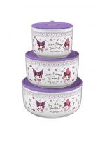 - Set of 3 bowls with vacuum silicone lids, authentic copyright, My Melody & Kuromi pattern.