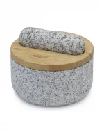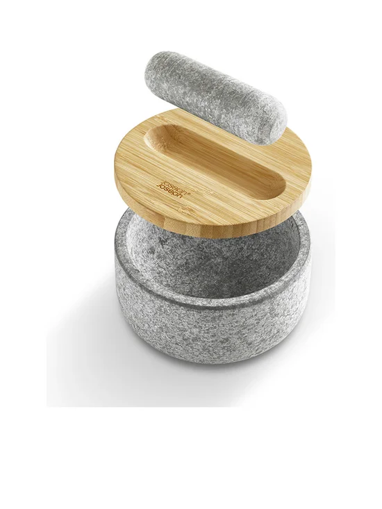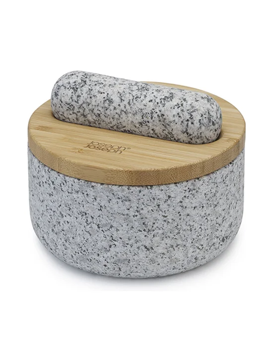 Let you enjoy cooking with a stone mortar from JOSEPH brand. Heavyweight design carved from hard-wearing natural granite. Bamboo lid keeps mortar clean and dust-free when stored. Pestle stores safely on top of lid. Lid can also be used for holding ingredients or as a small chopping surface. Ideal for making spice rubs, pastes, dressings, sauces and marinades. Care & use:To minimize staining, wash parts by hand immediately after use and allow to air dry. Do not soak lid. To maintain best condition, oil bamboo regularly with a food-safe mineral oil. Ensure lid is fully dry before storing.