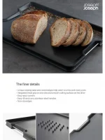 Multi-purpose chopping board from the brand JOSEPH JOSEPH. Cut&Carve™ Plus serves up multiple uses in one colourful design. One side features an integrated meat grip for extra help with carving while the other provides a smooth cutting surface for all other types of food prep. Other clever details include an angled base, raised edges and easy-pour corners for collecting and disposing of crumbs and liquids. If a Sunday roast is on the menu, you’ll want Cut&Carve™ Plus on the worktop.