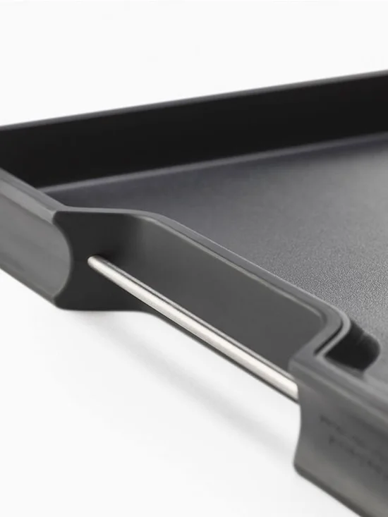 - Unique sloping base and raised edges help catch crumbs and meat juices