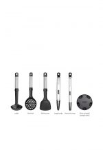 - Set includes solid turner, ladle, slotted spoon, precision tongs, large tongs