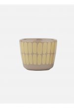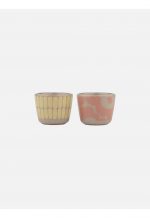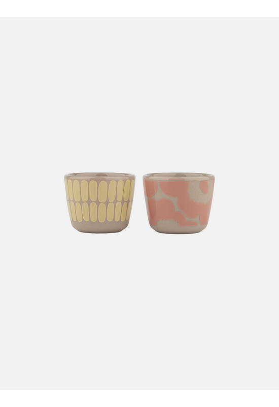 These egg cups are made of brown stoneware, which is dishwasher, oven, microwave, and freezer proof. This set includes two egg cups, one with the Alku pattern and one with the Unikko pattern.