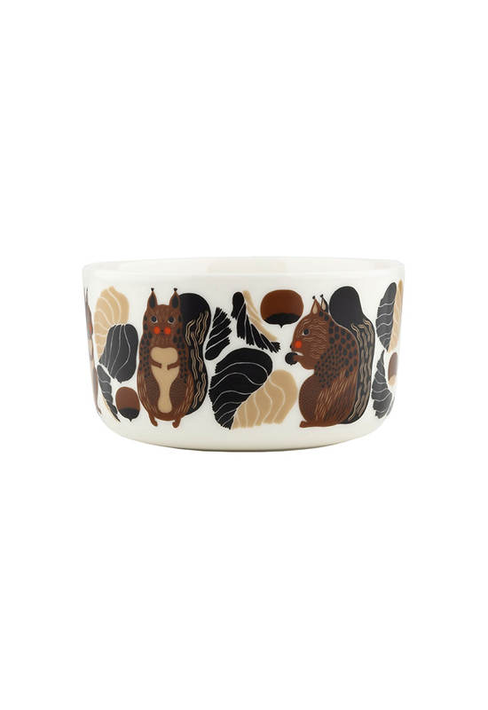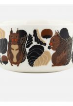 Extending Aino-Maija Metsola’s tales from the forest, the Kurre (squirrel) pattern presents a lively brood of squirrels collecting and hiding nuts – squirrels were a common sight in the designer’s childhood yard. The initial artwork was created on paper using a brush and ink.