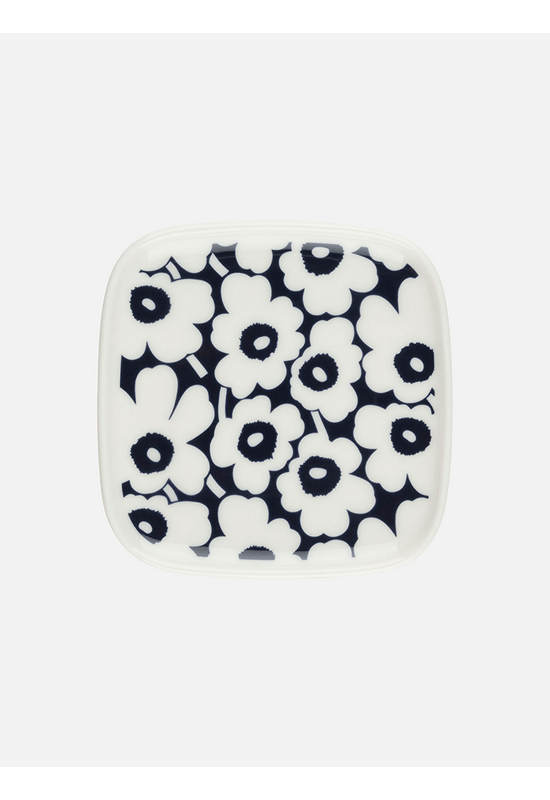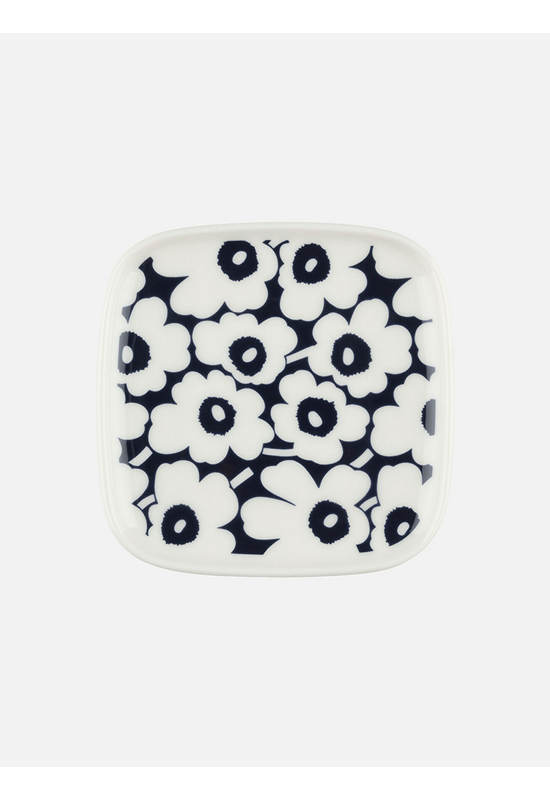 The square shaped Oiva plate is made of white stoneware, and it features the Pikkuinen Unikko pattern. The plate is dishwasher, oven, microwave, and freezer safe.