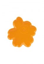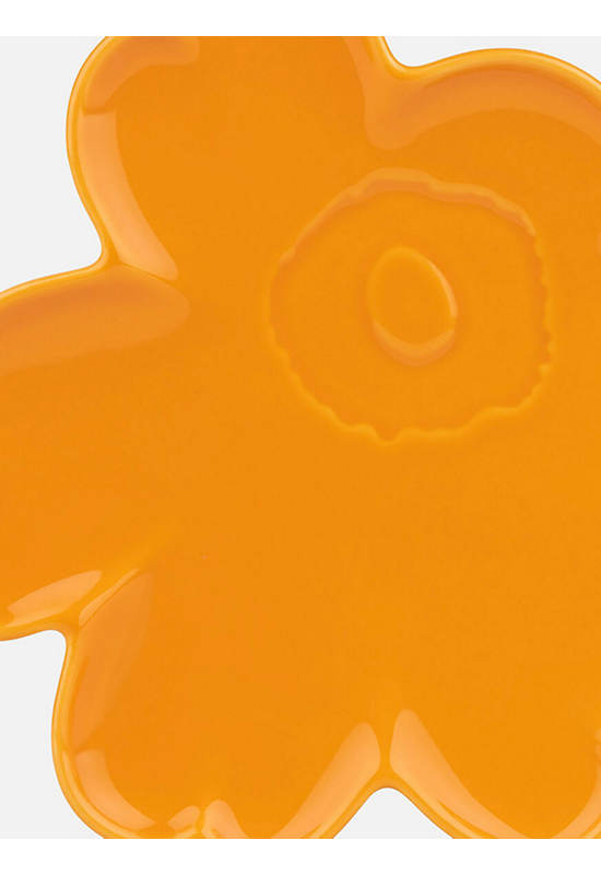 The Unikko flower shaped plate is made of ceramic with a yellow-orange glaze. The colored glaze may give the item a lively color. We recommend washing the plate by hand. While it can be machine washed, the unique design may be at risk of damage if in contact with other dishes.