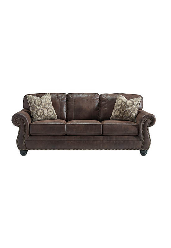 Rich with the traditional beauty of nail head accents and stylish window pane stitched details, the “Breville-Espresso” upholstery collection offers plush comfort elegantly wrapped within a rich faux leather upholstery. The sweeping rolled arms and rich finished bun feet perfectly work together to magically transform the décor of any living room environment.