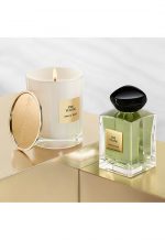 Alongside the ARMANI/PRIVÉ CANDLES’ olfactory experience, their design creates a striking aesthetic, as the candles stand as elegant art objects. Chiming with GIORGIO ARMANI’s commitment to creating beautiful objects that last, the candles’ glass vessels are crafted with a sleek, Art Deco-inspired shape. The vessels’ interior is lacquered beige, resulting in the candles’ elegant, neutral tone. Each candle is set with the gold plaque that adorns the ARMANI/PRIVÉ fragrances, bearing the scent’s name. As an elegant touch, a gold lid, embossed with ARMANI/PRIVÉ, sits atop the jar. This can be placed underneath the candle to showcase the jar or used to extinguish the candle after burning.