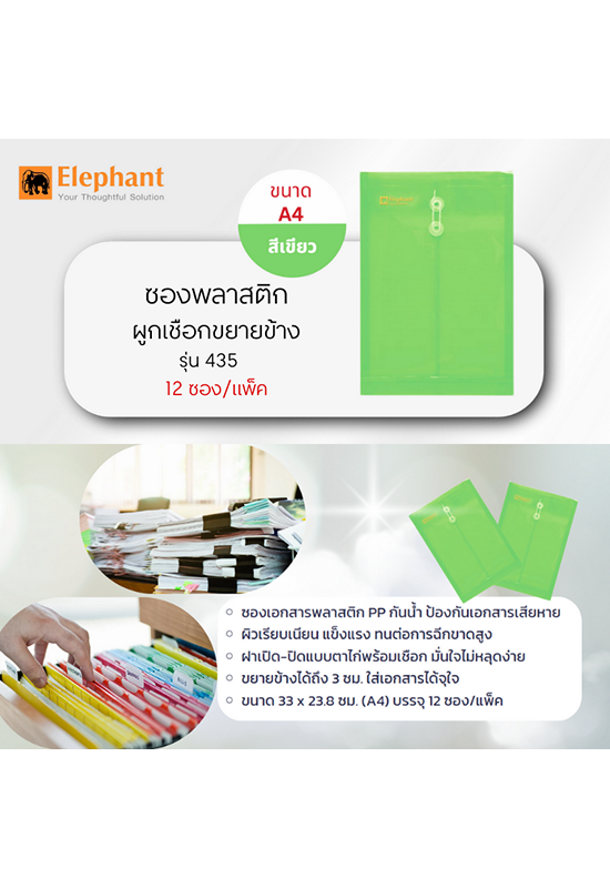 ELEPHANT ELEPHANT ซองพลาสติกผูกเชือกขยายข้าง รุ่น 435 สีเขียว ขนาด A4 (แพ็ค 12 ซอง). 100% оригинал