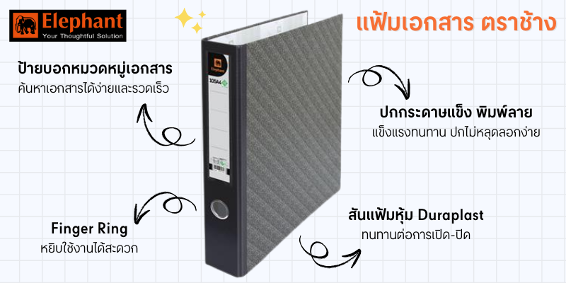 ELEPHANT แฟ้มสันกว้าง ตราช้าง รุ่น 105A4 ออกแบบมาเพื่อการจัดเก็บเอกสารขนาด A4 ได้อย่างเป็นระเบียบและทนทาน ปกกระดาษแข็งพิมพ์ลายไทยเสริมความแข็งแรง สันแฟ้มหุ้ม Duraplast เพิ่มความทนทานต่อการใช้งาน พร้อม Finger Ring ช่วยให้หยิบใช้งานสะดวก ภายในติดตั้งคลิปก้านยกมาตรฐาน รองรับเอกสารได้สูงสุด 300 แผ่น จัดเก็บเอกสารได้อย่างมั่นใจ เลือก แฟ้มสันกว้าง ตราช้าง