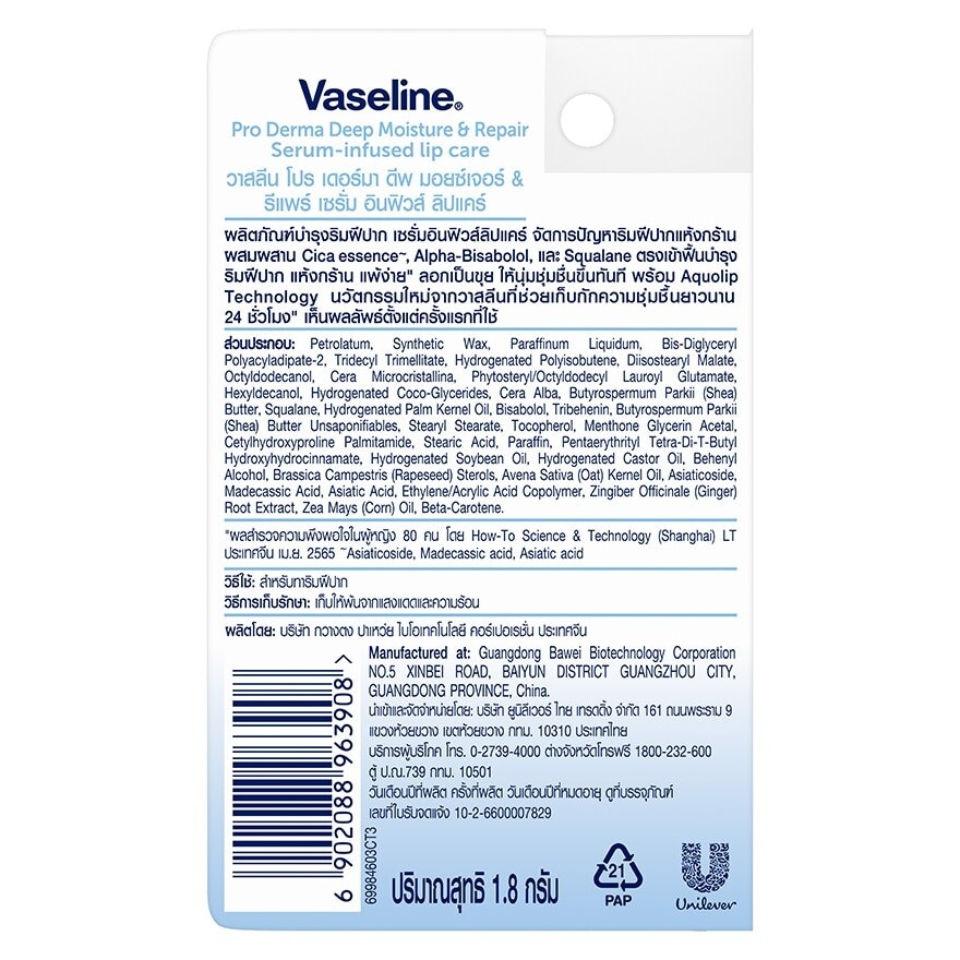 «Вазелин Про Дерма Лайн Кеа Рипар Сёрум Глубокое Восстановление и Интенсивное Увлажнение Губ 1,8 г» (перевод названия косметического средства с английского и тайского языков) – Vaseline Pro Derma Lip Care Deep Moisture Repair Serum Infused 1.8 G. บำรุงริมฝีปาก