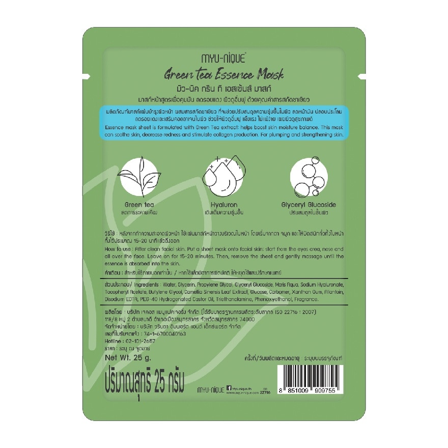 Маска для лица МиЮ-Ник Грин Ти Эссенс Мейс 1’С — увлажняющая, успокаивающая, с экстрактом зелёного чая, уменьшает покраснения, придаёт коже свежесть и мягкость. – Myu-Nique Green Tea Essence Mask 1’S มาสก์หน้า คุมมัน ลดรอยแดง ผิวดูอิ่มฟู